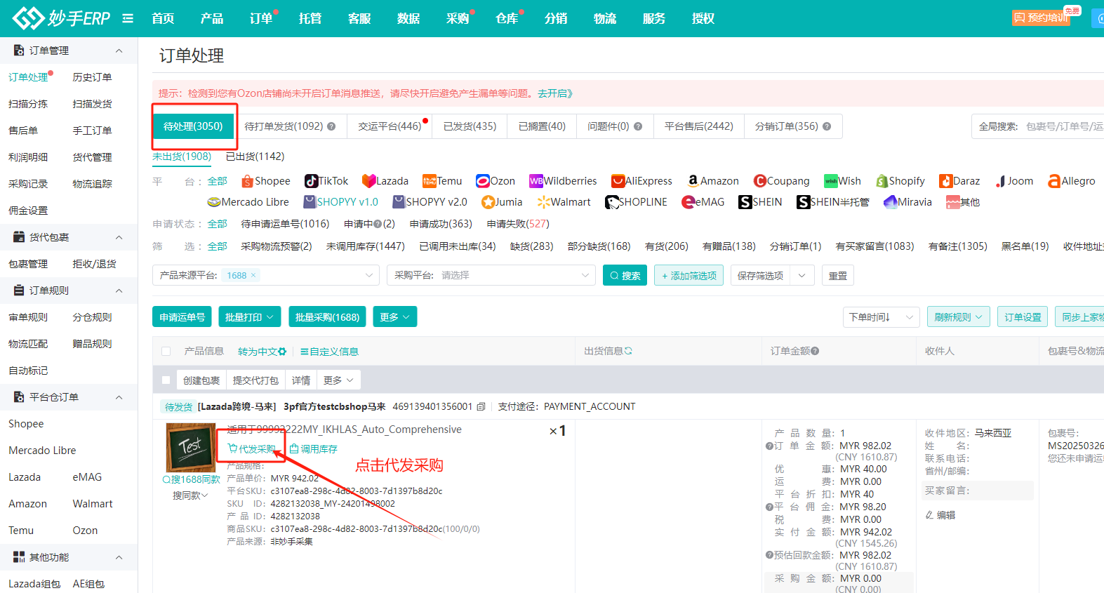 (1)进入妙手ERP=>订单=>订单处理,目前已授权平台的所有订单会汇总到这个界面中