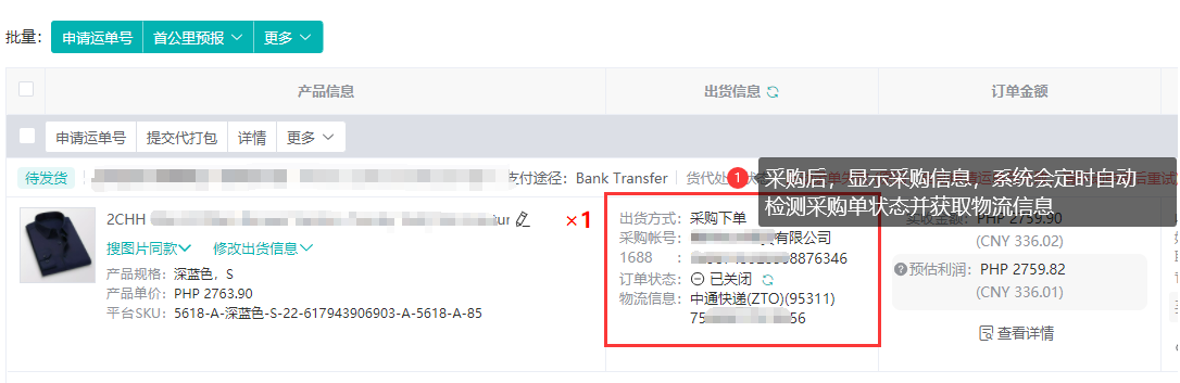 (7)完成采购后,在“出货信息”列内会显示采购信息,系统会自动同步采购单相关信息;