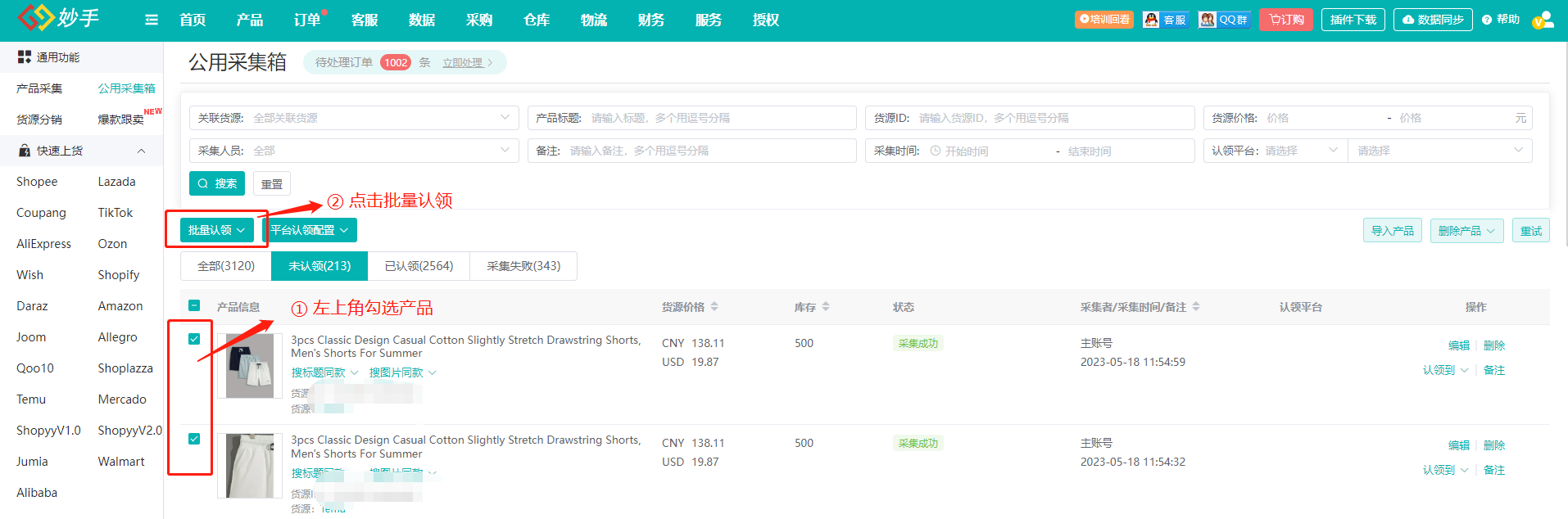 采完的货会自动存到 “公用采集箱”,这时候要做的就是 “认领产品”—— 把货挪到美客多专属的采集箱里。进 “产品 - 公用采集箱”,勾选要上新的产品,点 “认领到”,选美客多平台就行。要是采错了或者想重采,在这还能看采集失败的原因,比如链接失效了,改个链接重新采就好,不用瞎琢磨哪里出问题。