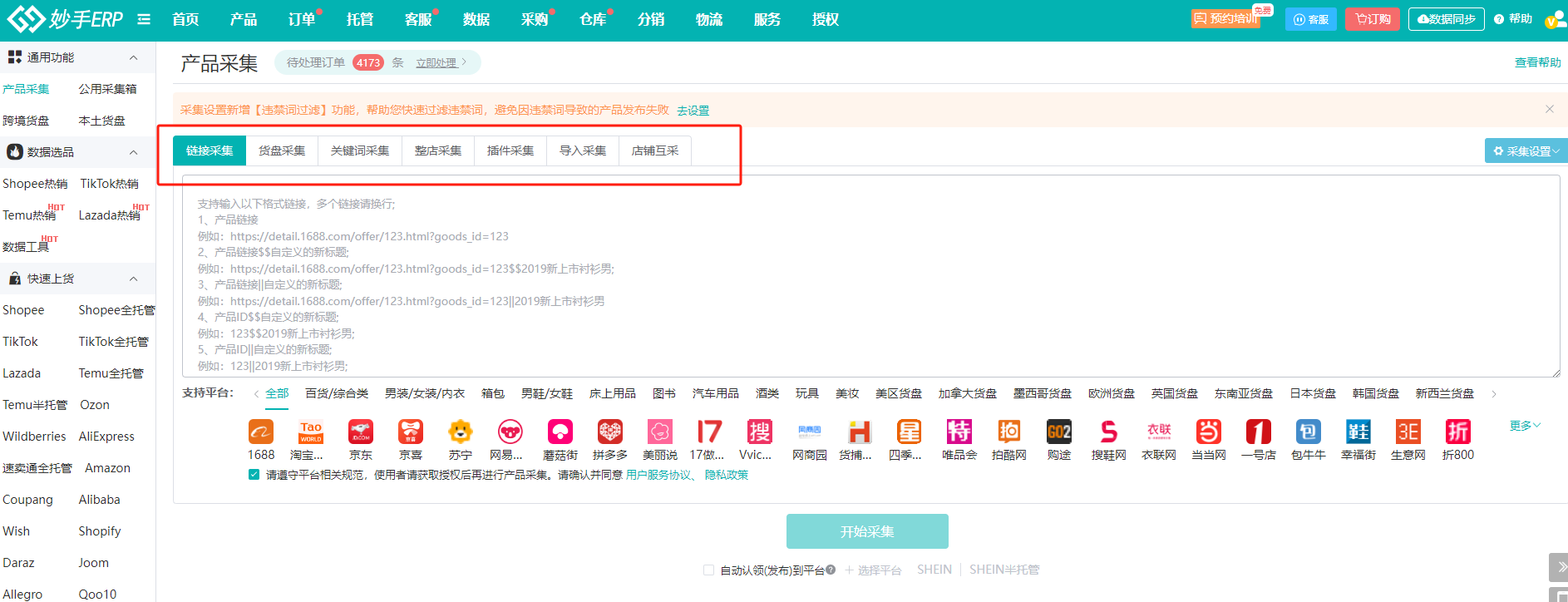 这步骤是核心的“找货”环节,考虑美客多产品上新可以用哪些ERP,关键看能不能轻松采到货源,妙手这一点真的没话说,能采100 +国内外平台的货,像咱们常逛的 1688、Temu,还有美客多本土的货源平台都能采。操作也简单。先选择上方采集方式,再点击下方平台就会自行跳转,之后再根据相应方式去采集即可。