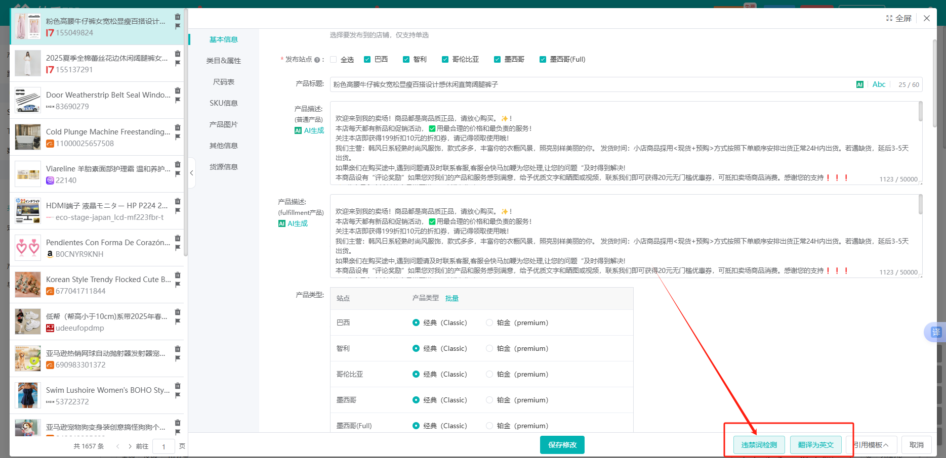 (5)右下角支持一键翻译和违禁词检测(自动检测产品标题、描述和SKU名称中是否含有的违禁词)。