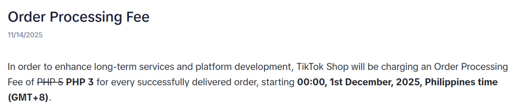 12月1日起,TikTok Shop菲律宾站将对每笔订单加收5比索(约合0.6元人民币)的订单处理费。