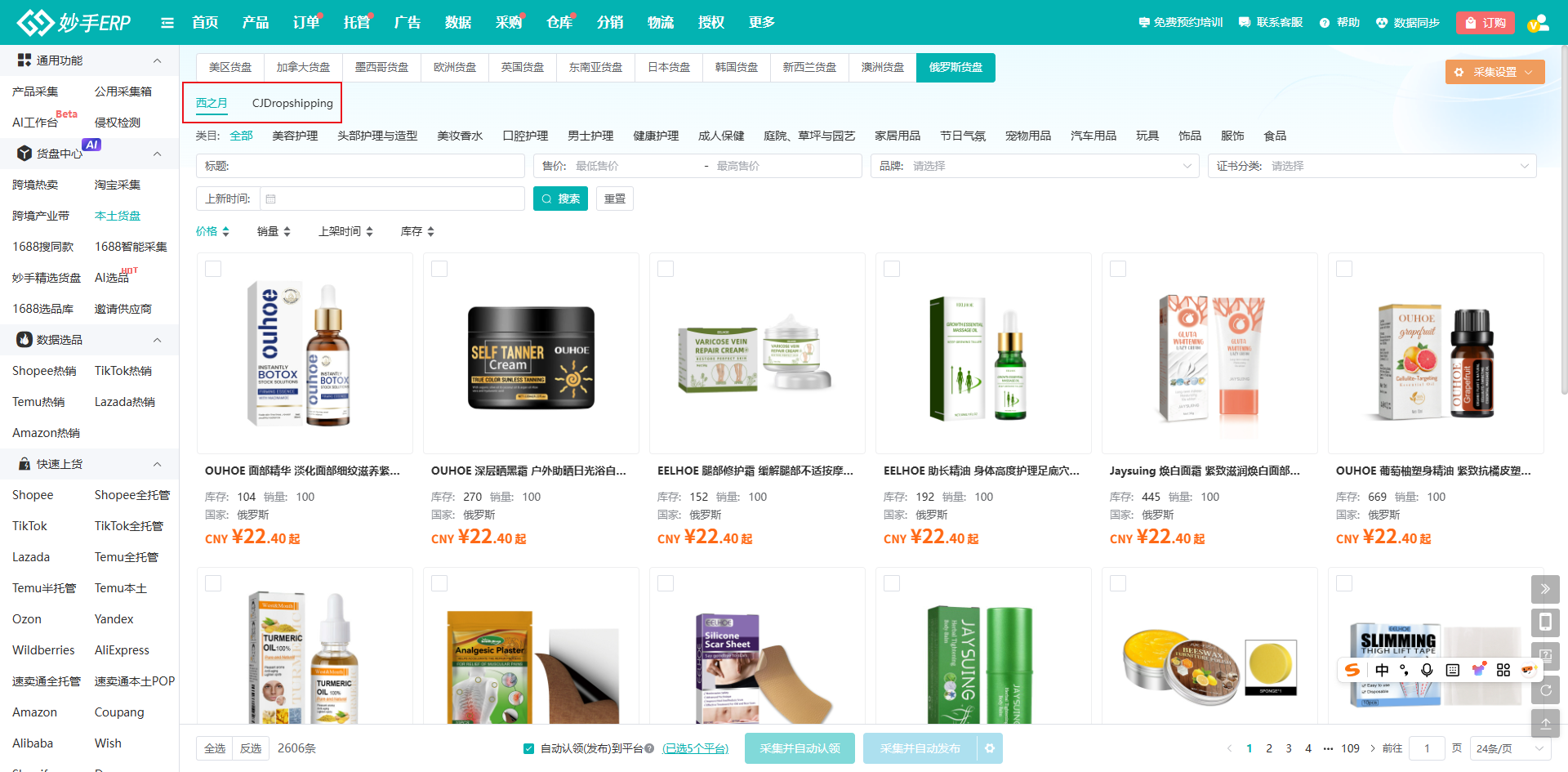 妙手ERP的本土货盘模块,深度对接俄罗斯本地10+核心供应链(包括西之月、CJDropshipping等知名本土供应商),覆盖Ozon平台所有热门类目: