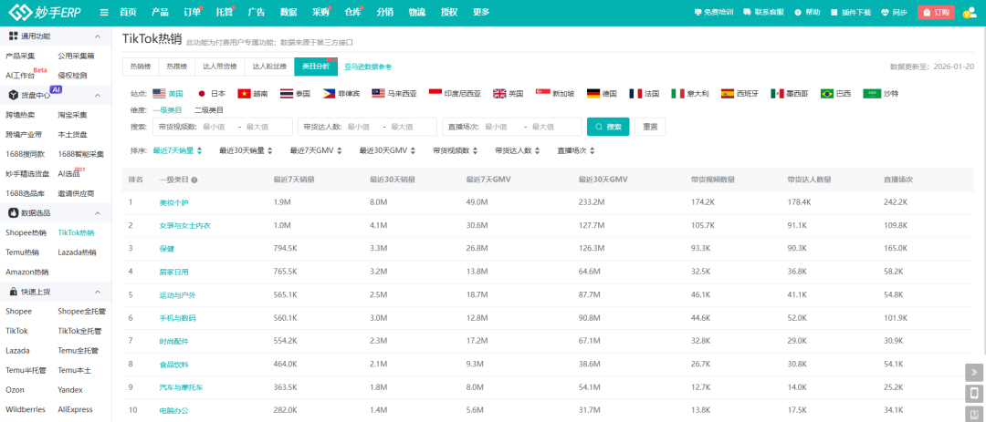 可以借助妙手ERP的TikTok热销功能,对标同类目、高转化的品类,重点关注美妆个护、家居日用、手机数码等类目在各大站点的市场热度,用数据驱动选品,减少试错成本。