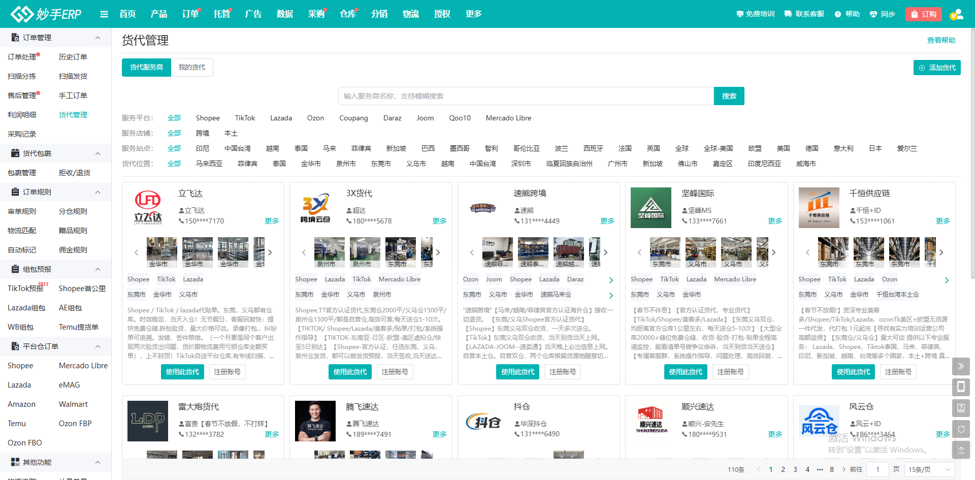 同时,系统整合了110+跨境货代服务商,覆盖Shopee、TikTok小店这些主流平台的物流需求,卖家可按价格、时效、服务评分直接筛选货代,一键对接发货,省掉所有中间环节,让采购发货的效率提升数倍。