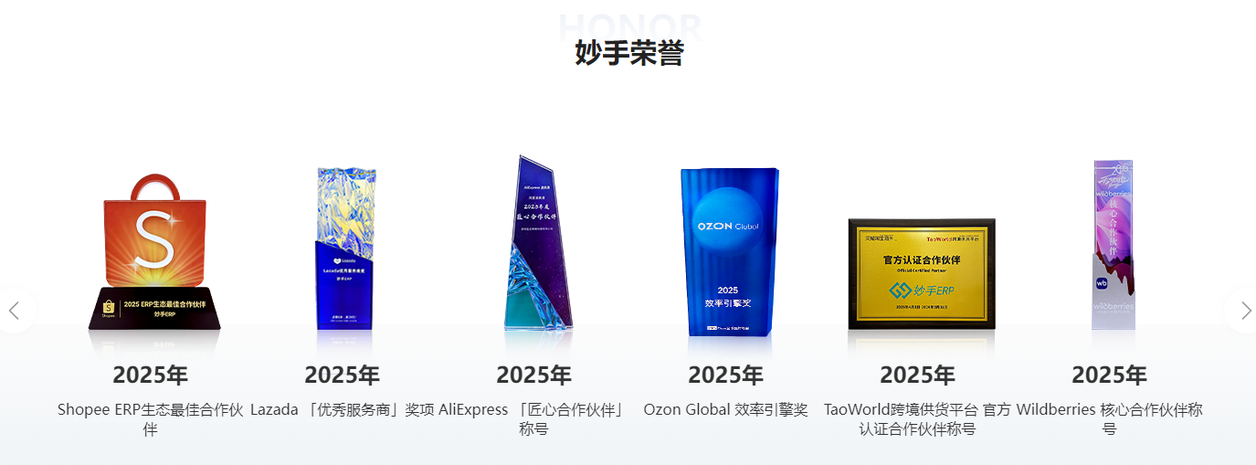 妙手在跨境电商ERP领域已有十年的经验,产品功能和服务已经非常成熟和稳定,每一年都会获得TikTok Shop、Shopee、Ozon、Lazada等主流跨境电商平台的年度奖项,2025年还获得了: