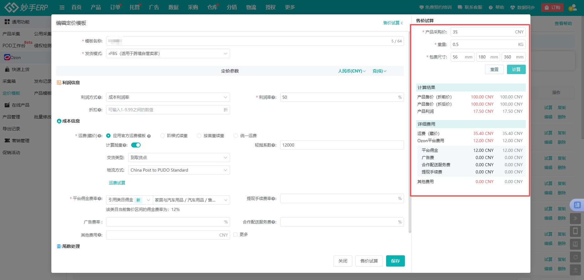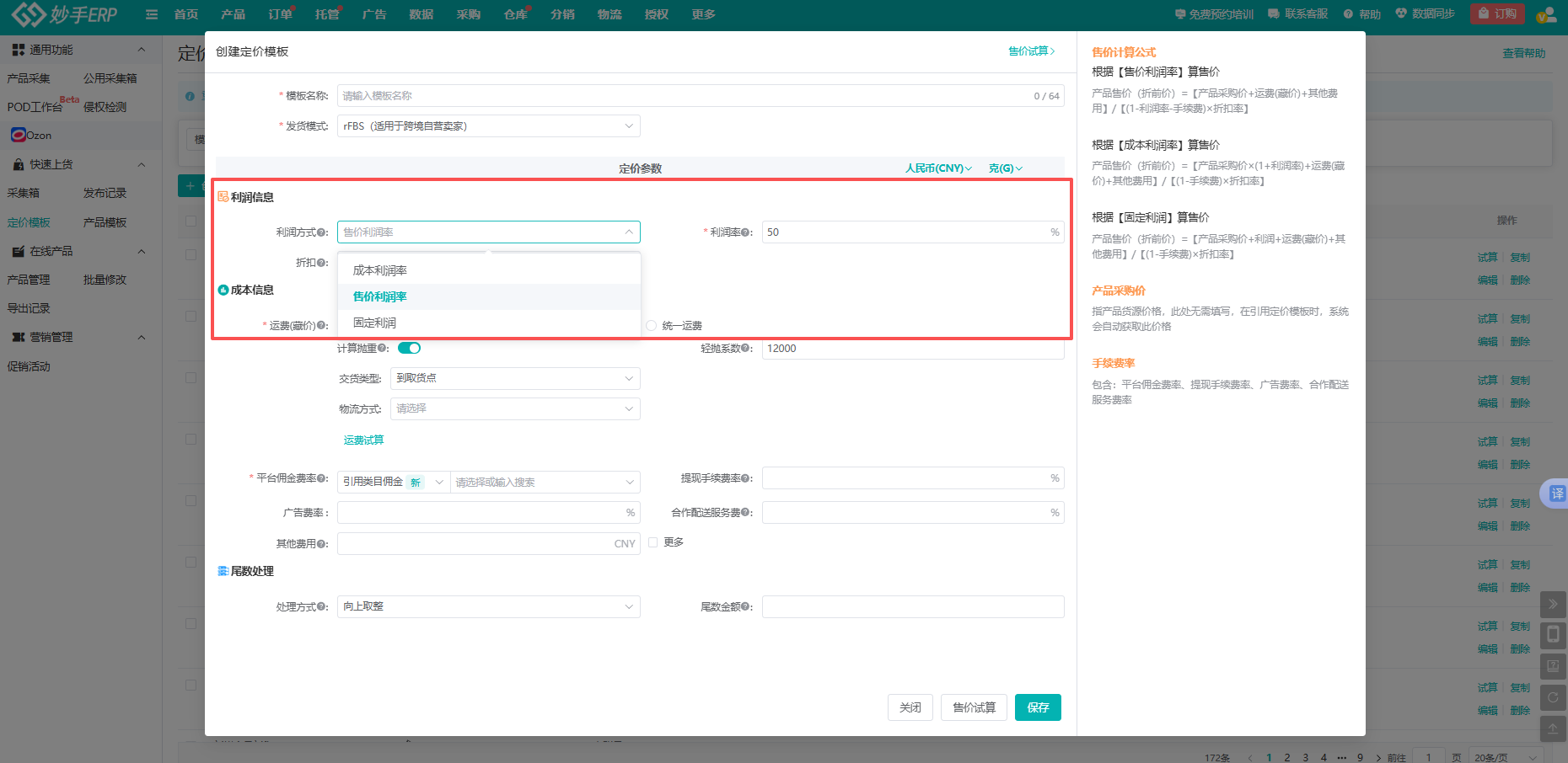 妙手ERP已经预设了各模式的专属定价模板,直接选择对应的模式,系统会自动匹配成本和佣金规则,不用自己去查平台最新政策,这一步就能省掉大半时间。