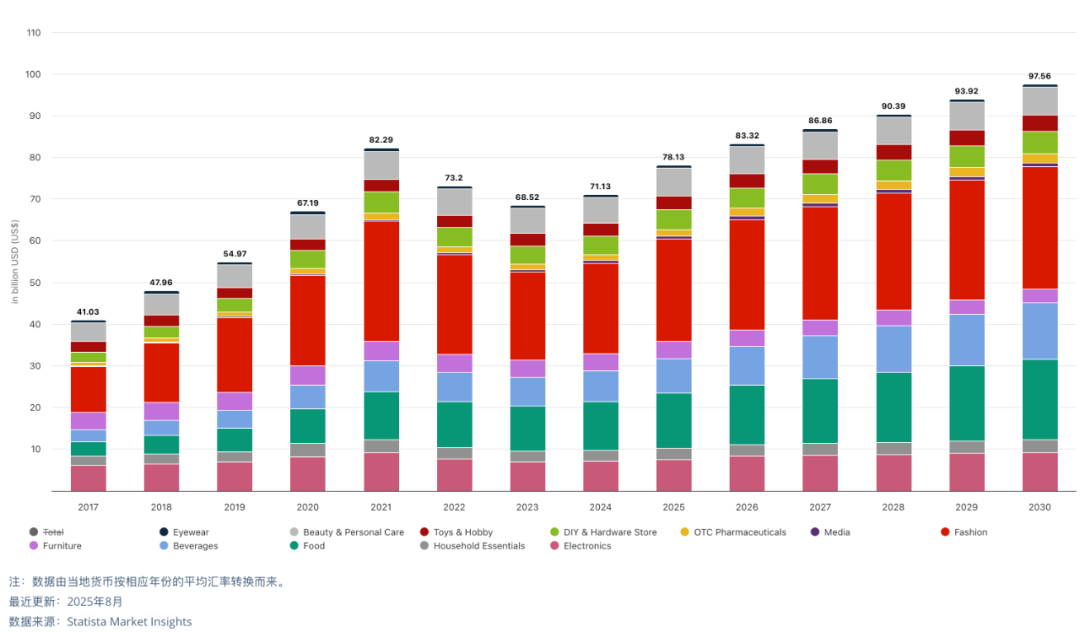 据STATISTA数据,传统的家具、服装、食品、美妆个护、3C家电等品类一直稳如老狗。