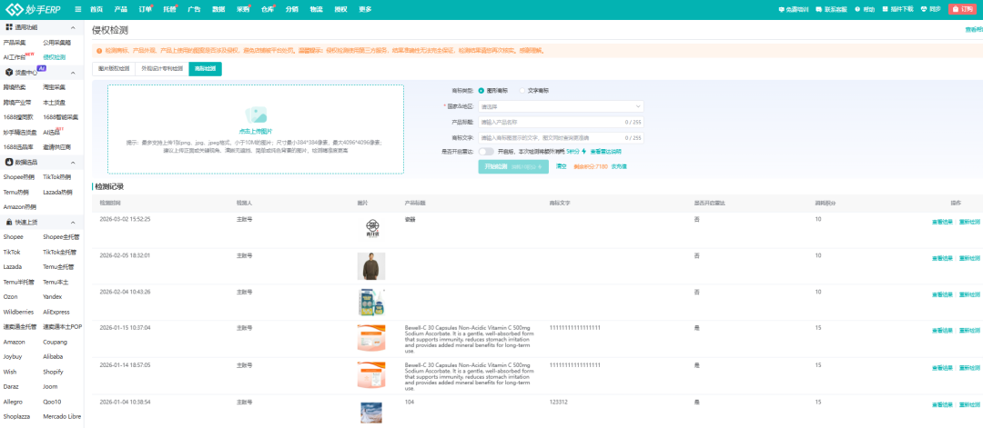像大家在前期选品的时候就可以将利用妙手ERP的侵权检测功能,针对商标、外观设计和图片等方面,一键检测侵权行为,提前规避合规难题。