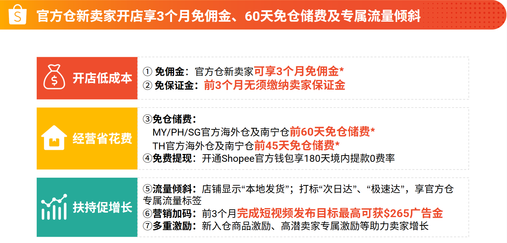 官方仓新卖家开店享3个月免佣金、60天免仓储费及专属流量倾斜!
