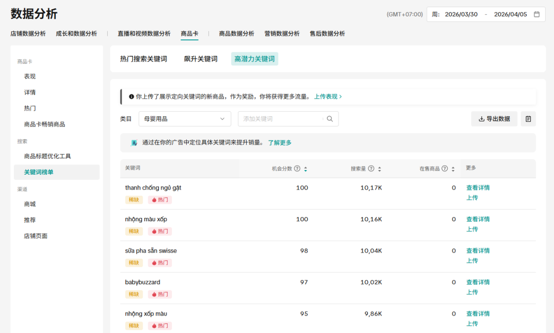卖家可以搜索同产品类目,看看前排的飙升/高潜力关键词有哪些,筛选后将推荐词加到自己的标题里,这是提升商品曝光最有效的办法。