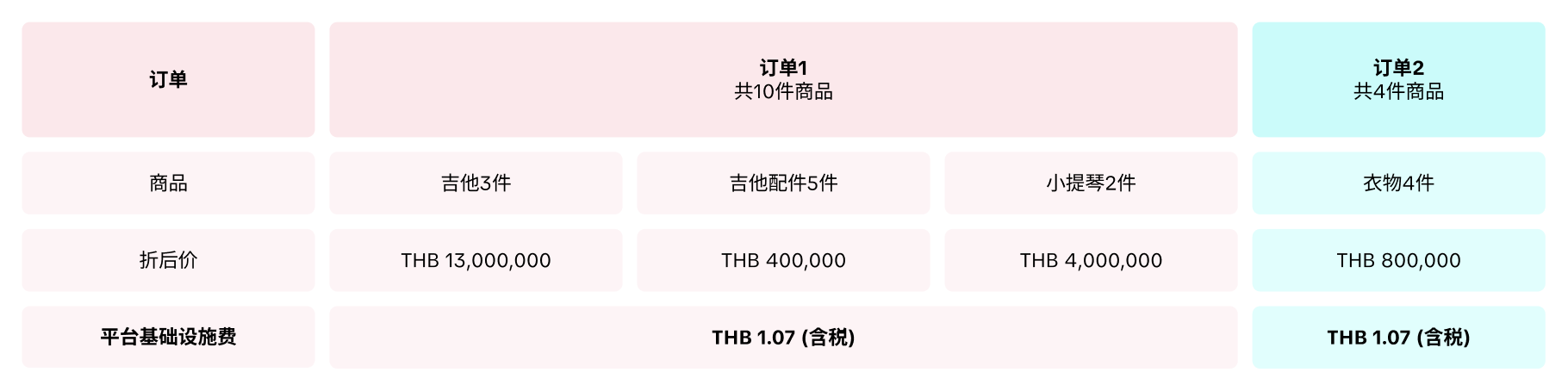 平台基础设施费固定为每笔成功交付的订单1.07泰铢(含税),无论订单中包含多少件商品。