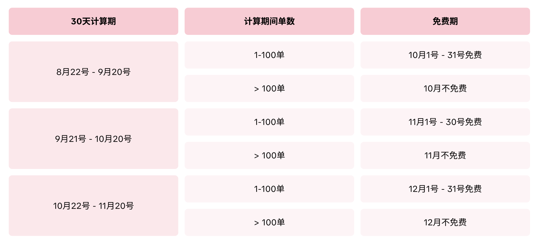 为助力卖家顺利开展业务,TikTok小店将对过去30天内订单量在1至100单(含1单和100单)的卖家减免该项费用。该30天考核期截止于每月20日,通过考核的卖家可享受整个次月的费用减免。