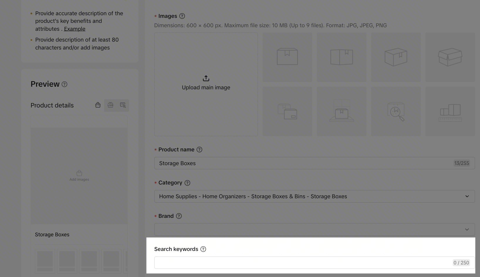 商品搜索关键词和商品亮点不是发品必填字段,您可以通过填写上述两个字段获得更多搜索曝光机会。