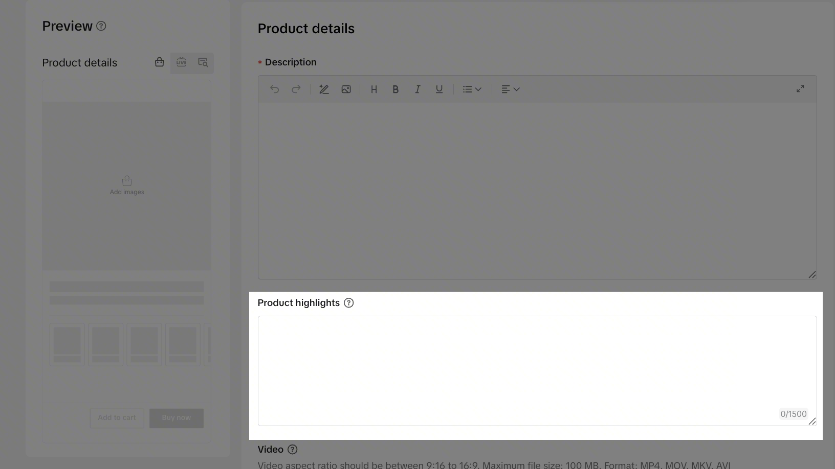 进入商品发布界面,下滑找到Product highlights模块,支持在详描的基础上进一步总结商品核心卖点。