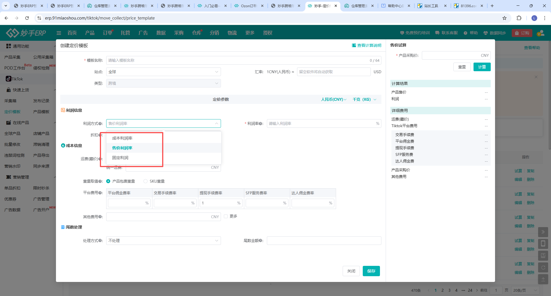 最后,建议卖家朋友选择相应站点创建定价模板,妙手会根据各站点平台费用收取维度、利率的变化,针对性进行计算,生成结果更准确。