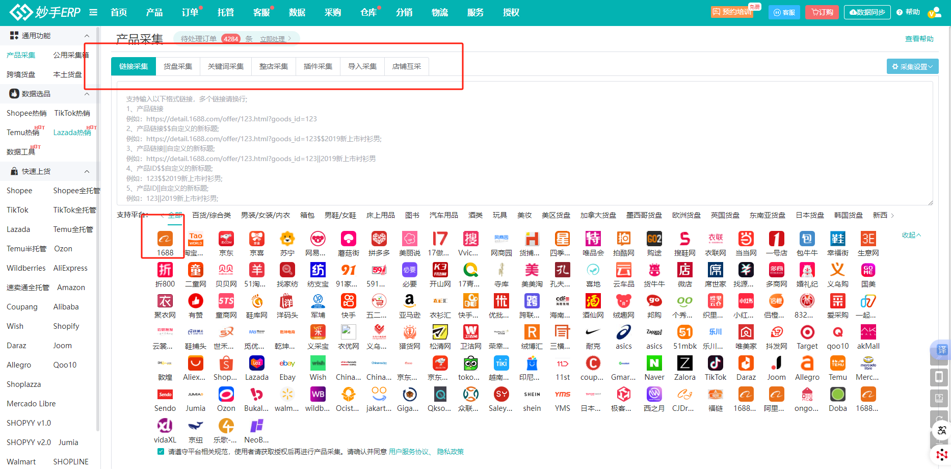 这是实现1688怎么一键铺货到虾皮的关键步骤。妙手ERP提供多种采集方式,