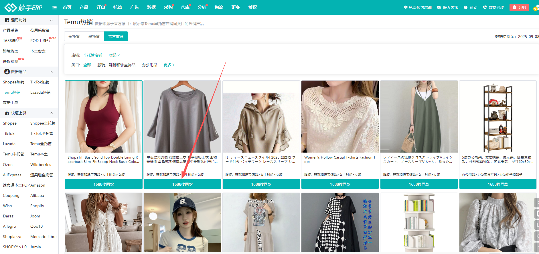 不用在不同页面间来回切换,不用手动整理杂乱的数据。妙手ERP整合了Temu全托管和官方推荐的热销商品信息,在一个界面内就能: