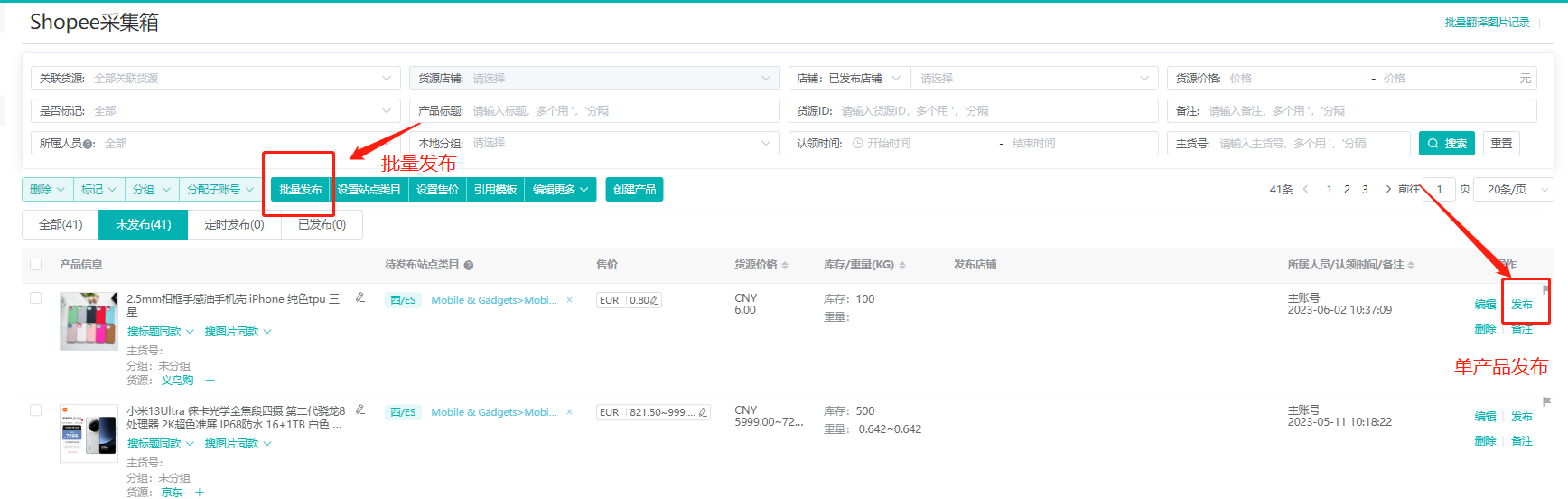 产品优化完成后,回到Shopee采集箱页面,即可批量勾选产品点击【批量发布】。
