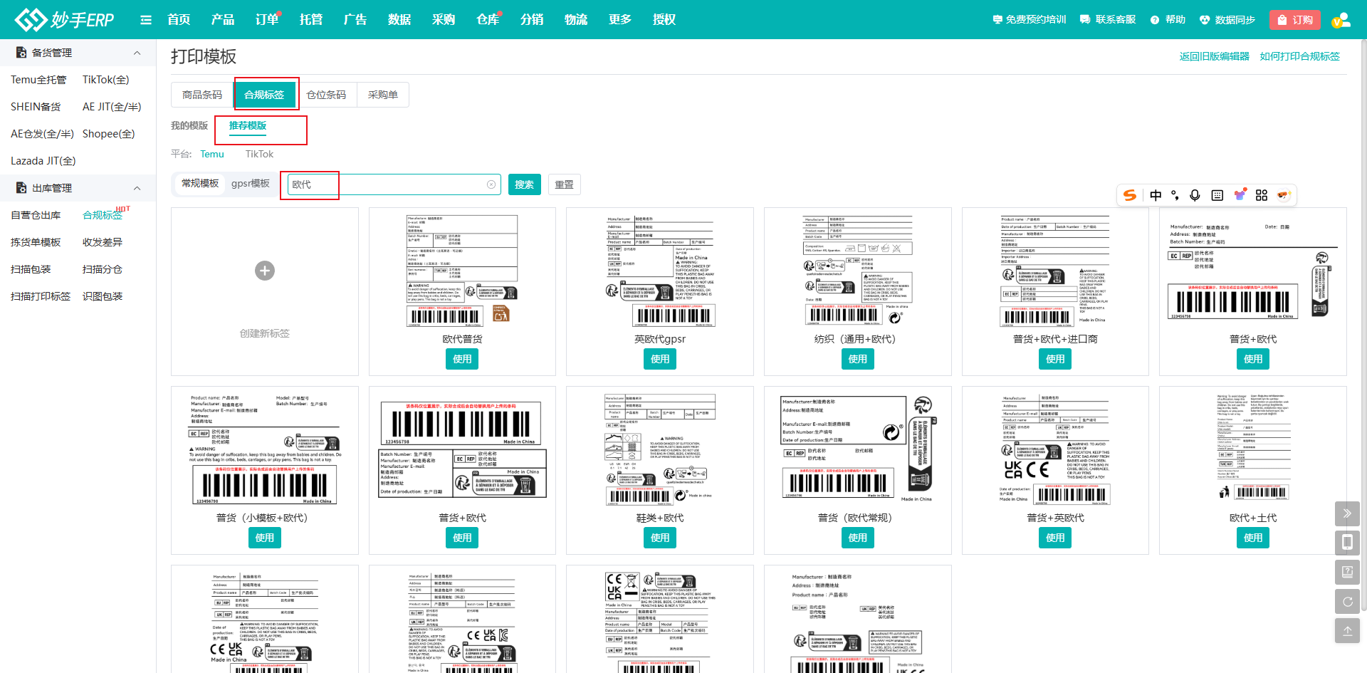 (2)进入合规标签中,在“推荐模板”中,搜索“欧代”,系统就会查询出所有关于欧代标签模板,卖家可以直接筛选平台、模板类型,直接使用模板