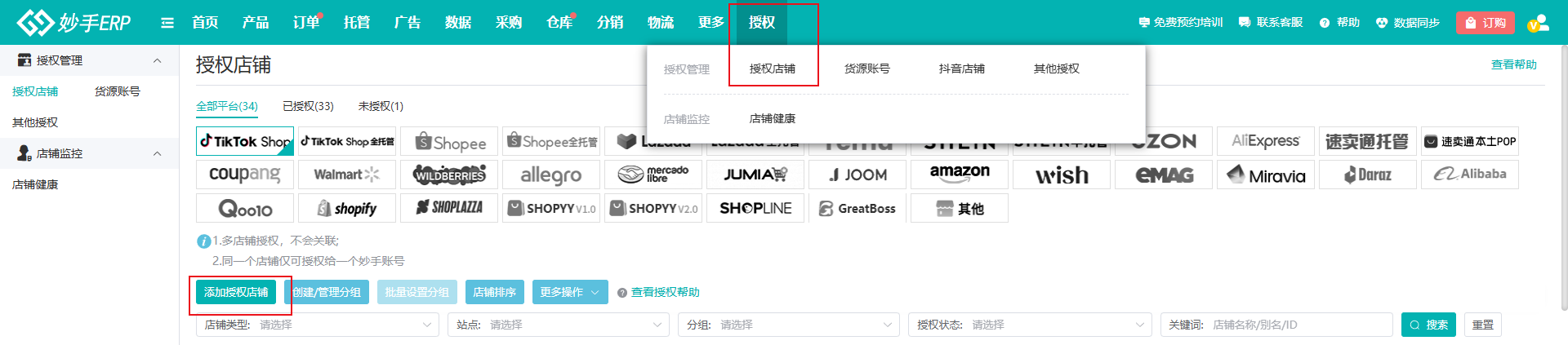 (2)然后将大家的店铺授权至妙手,首次使用需要将店铺授权至妙手,后续就不用再进行此操作了!