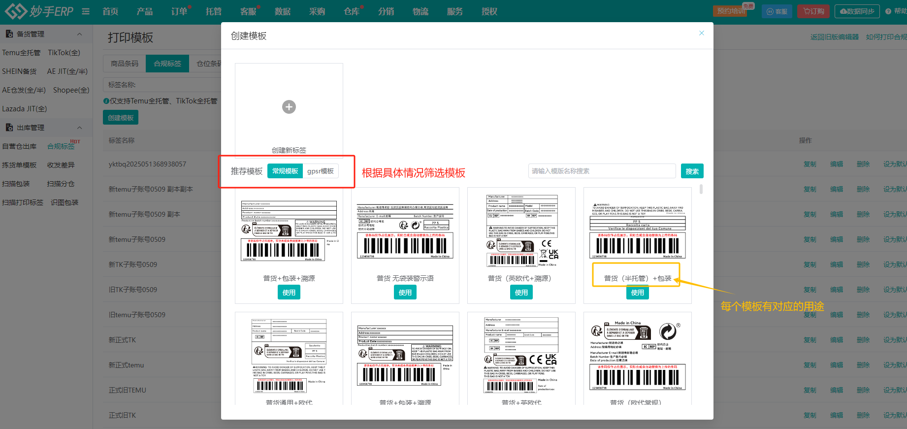 点击【创建模板】,根据实际情况,筛选常规模板或gpsr模板,并且每个模板有对应的展示信息、使用场景,用户根据实际需要选择模板即可