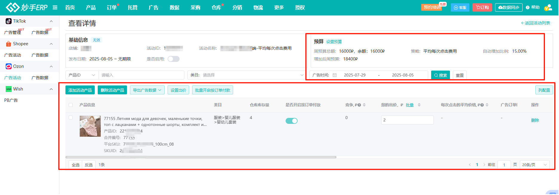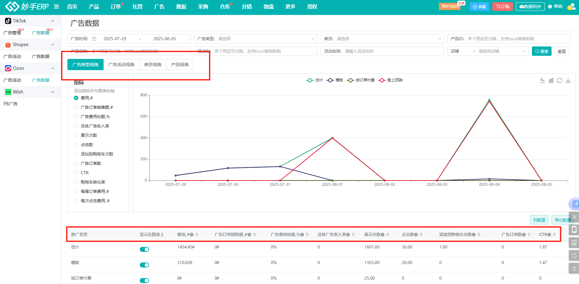 妙手ERP已接入Ozon模板广告、登上顶端广告及按订单付费广告三种类型。卖家可以根据产品所处的生命周期(如新品期、成长期、成熟期),灵活选择不同类型的广告组合,满足多样化运营需求。