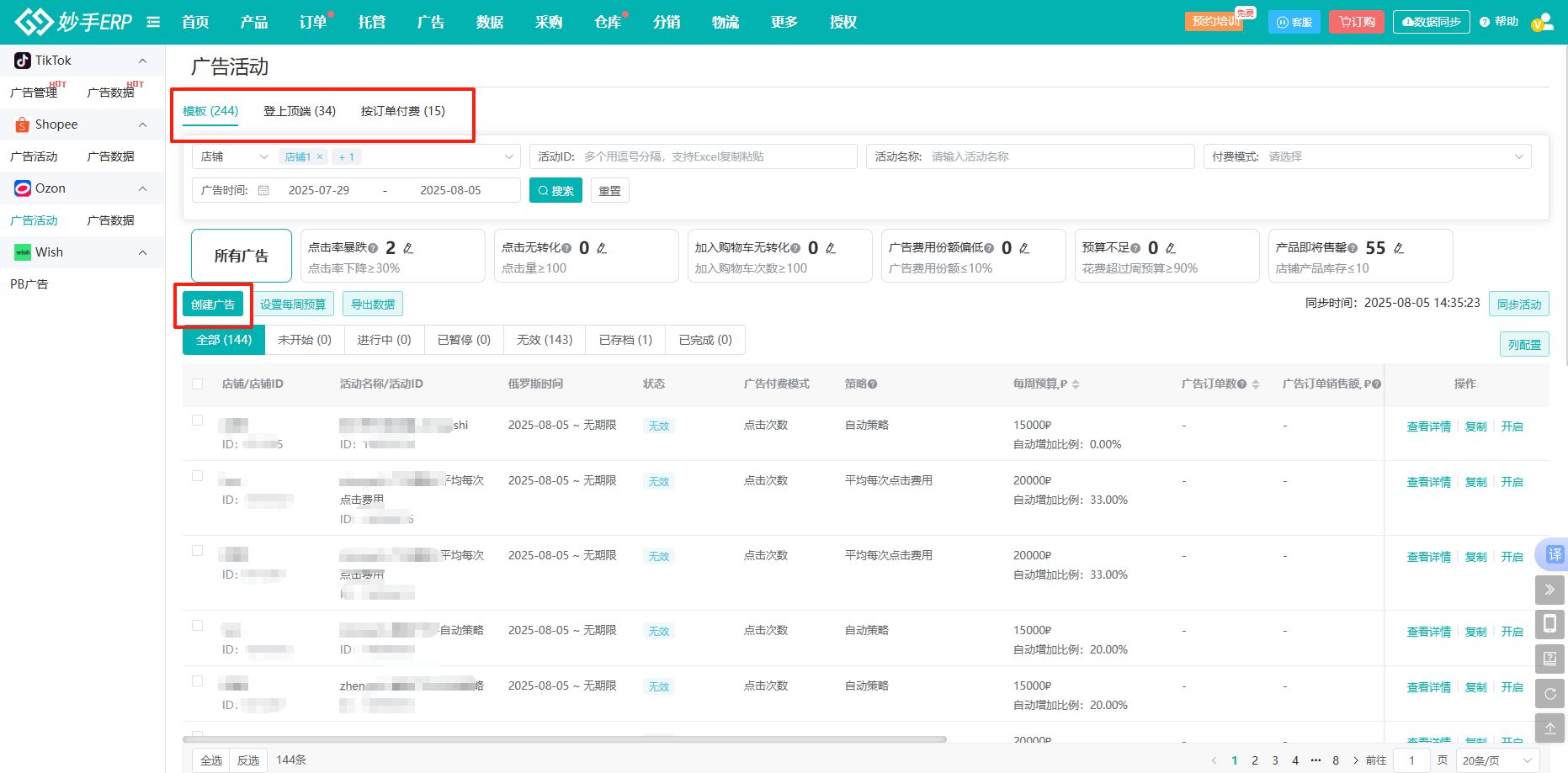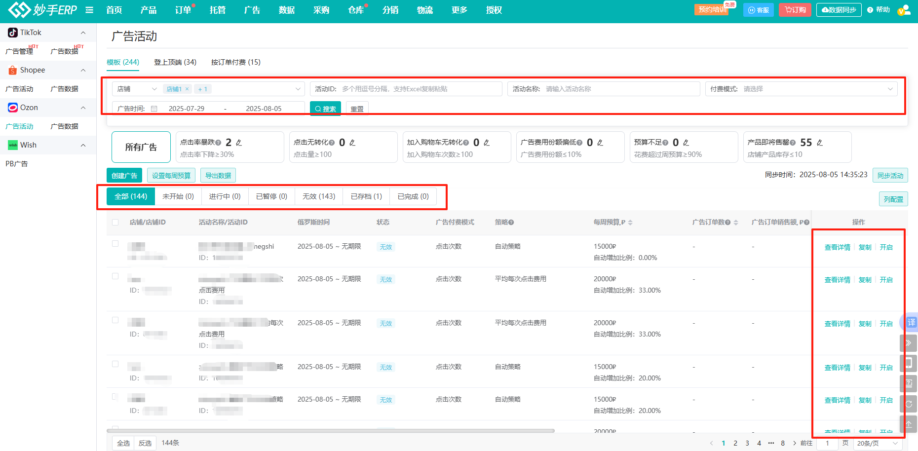 创建广告后,卖家可以通过妙手ERP统一管理所有店铺的广告活动。系统支持按店铺、活动ID、投放时间等多维度筛选,也可查看未开始、进行中、已暂停等7种以上状态下的广告列表。