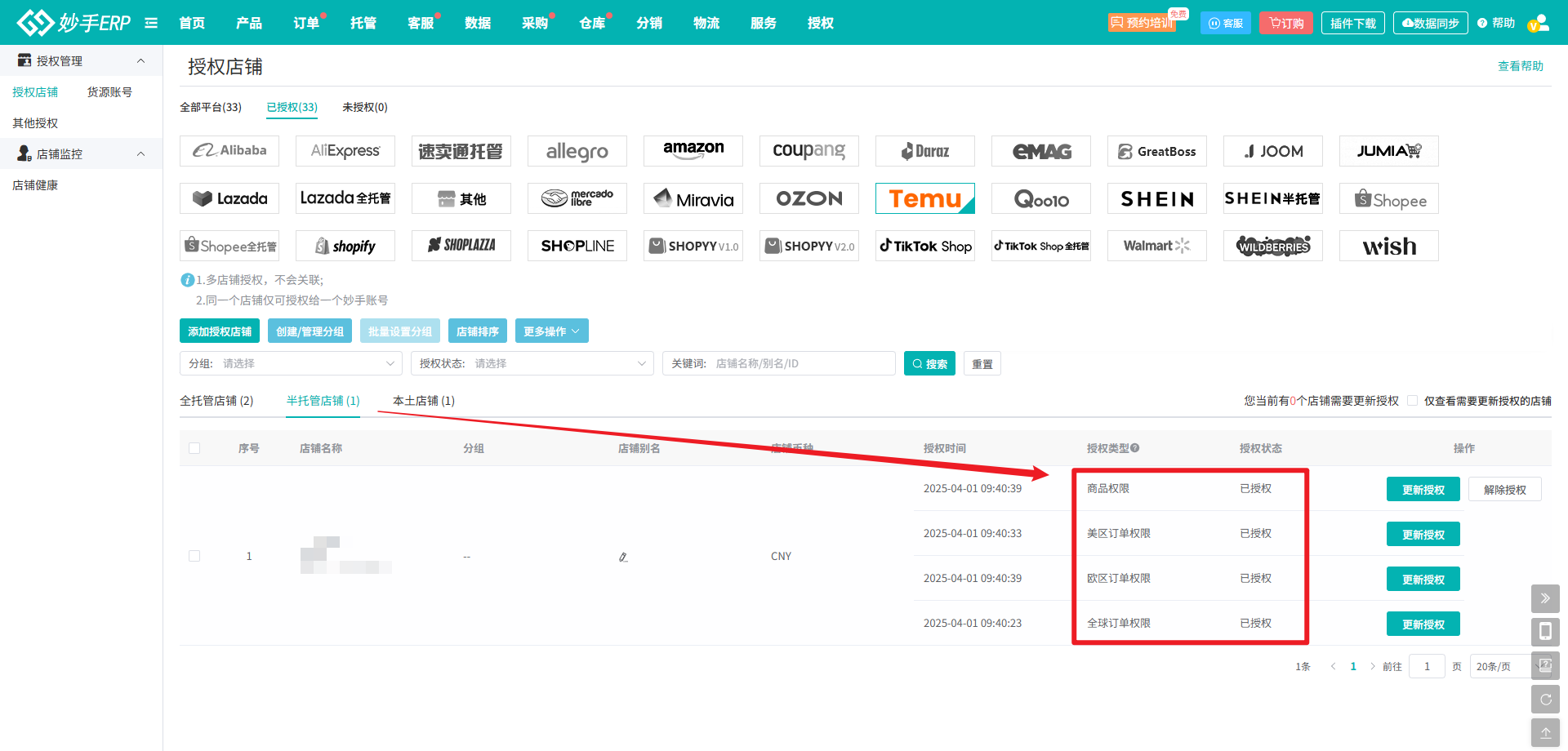 注册完账号登录妙手后,在授权模块选择Temu平台,之后按照操作指引完成店铺授权流程即可。为保障数据核算的准确性,建议授权店铺后,还需要完全订单权限的授权。