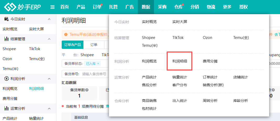之后回到妙手ERP=>数据=>利润明细页面,系统就会自动展现所有利润明细数据。