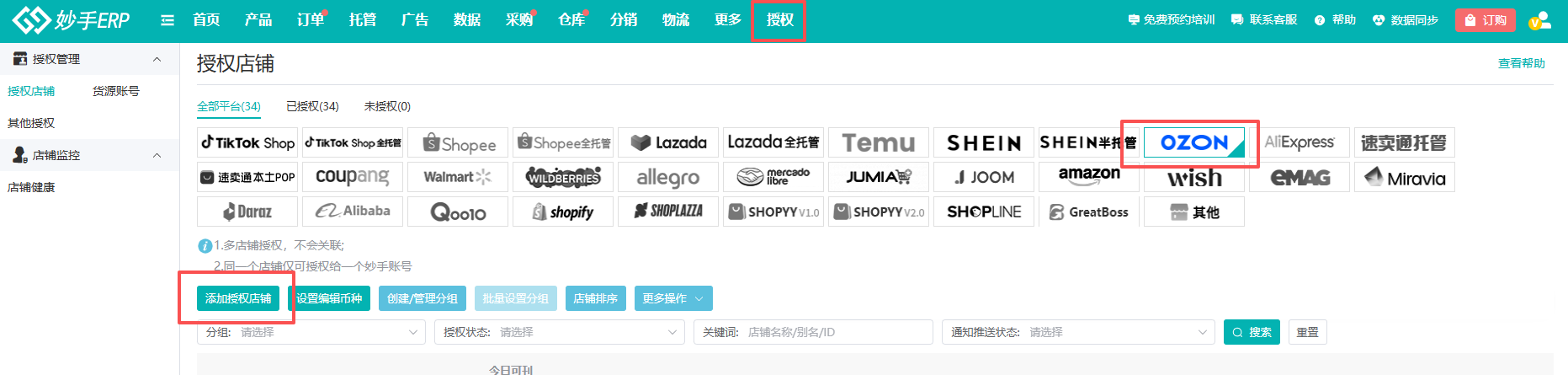 首次使用的卖家登录妙手后,需在授权模块按照指引完成Ozon店铺授权。授权成功,后续店铺订单即可自动同步至妙手,方便卖家直接在妙手处理订单与采购发货。