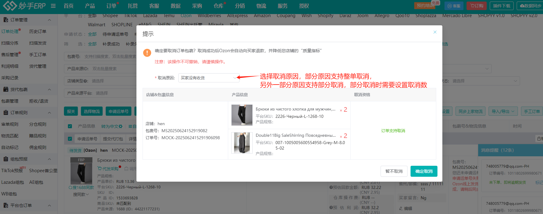 目前Ozon支持取消订单,卖家朋友在收到订单时候,若有出现产品缺货,或出单后发现没有利润还需要亏钱的情况,就可直接在妙手ERP上操作取消订单不发货。
