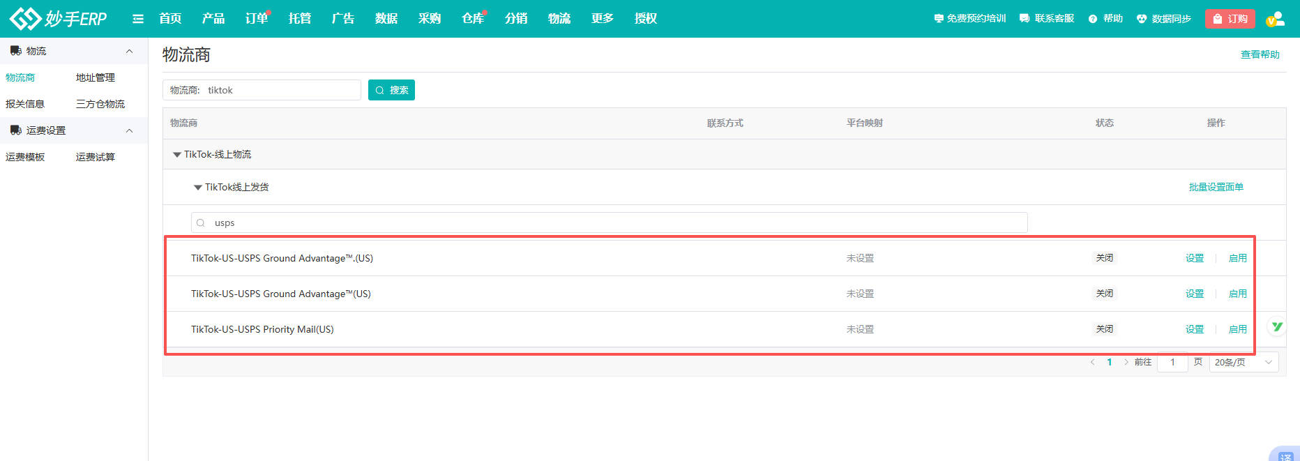 妙手ERP一键直连TikTok Shop线上物流,卖家在妙手启用并设置USPS物流渠道后,即可一站式完成运单申请、运费及配送时效测算、面单推送、物流同步等流程,确保发货合规。