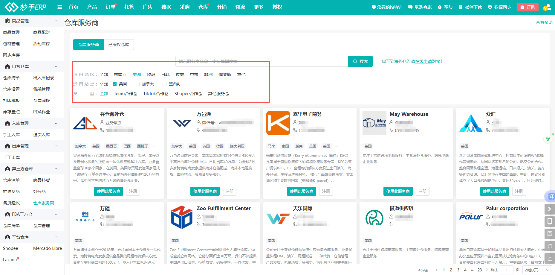 妙手ERP已整合多家优质的美国海外仓资源,卖家可借助妙手提供的详细介绍与联系方式,与服务商高效沟通,精准评估其资质是否符合运营需求,从而规避合规风险,简化运营流程。