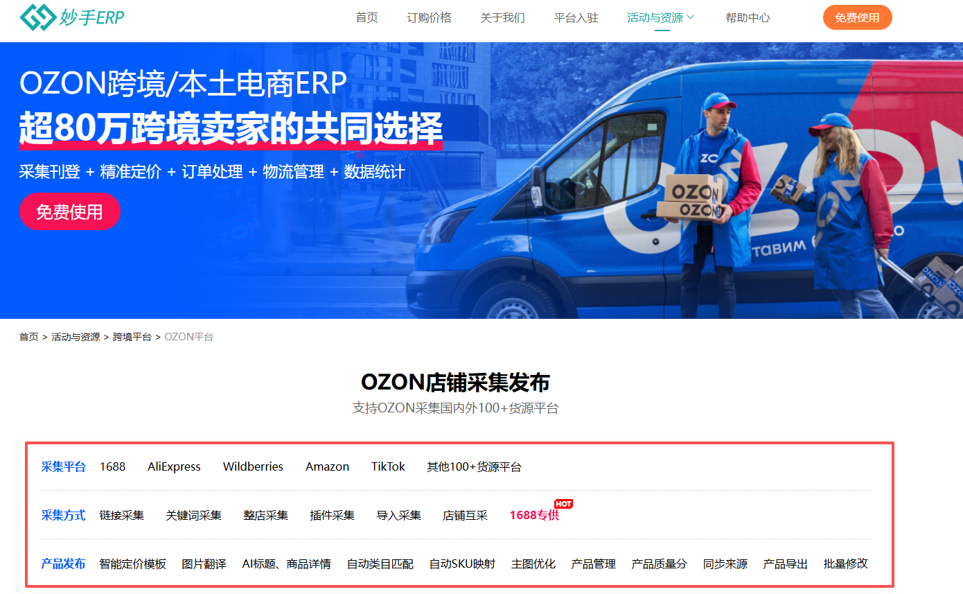 了解基础运营技巧后,实操建议大家借助第三方工具辅助操作。我用的是妙手ERP,免费可以绑定两个Ozon店铺,每天可以采集上架10个产品,而且功能非常齐全。