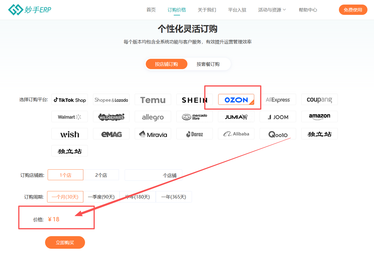 后续订购的话价格也不贵,妙手支持按照店铺数量订购,Ozon单店一个月仅需18元,个人卖家也能轻松负担,升级后即可采集7000+产品,完全足够一个店铺单月上架需求。