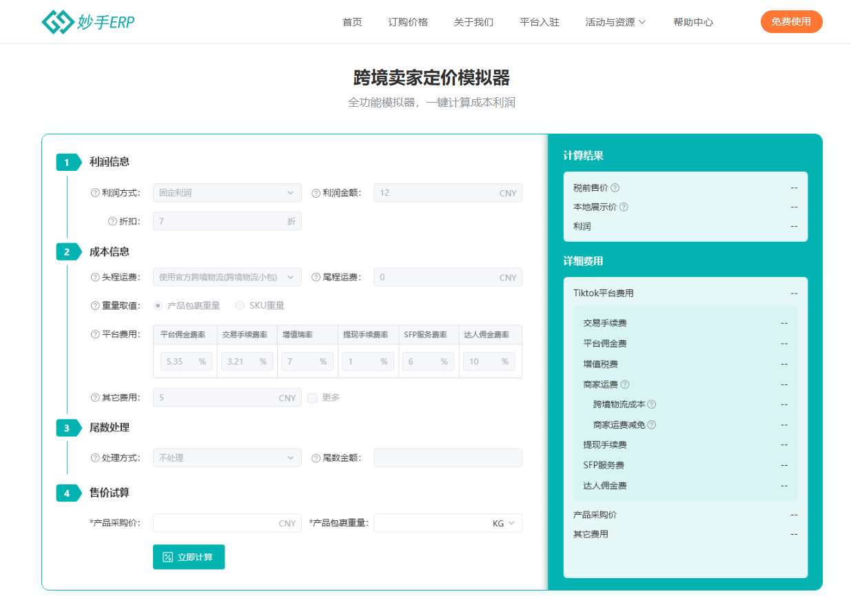 以我一直在用的妙手ERP为例,其TikTok定价模板就非常好用,并且操作便捷,可快速、精准地完成产品定价,显著提升定价工作的效率与准确性。
