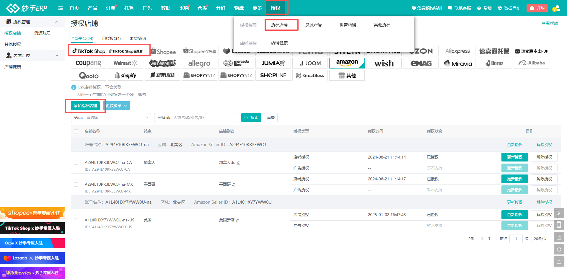 (2)注册账号后,点击授权-授权店铺-添加授权店铺,将您的Tik Tok店铺授权至妙手,首次完成授权后,后续可跳过此步骤。