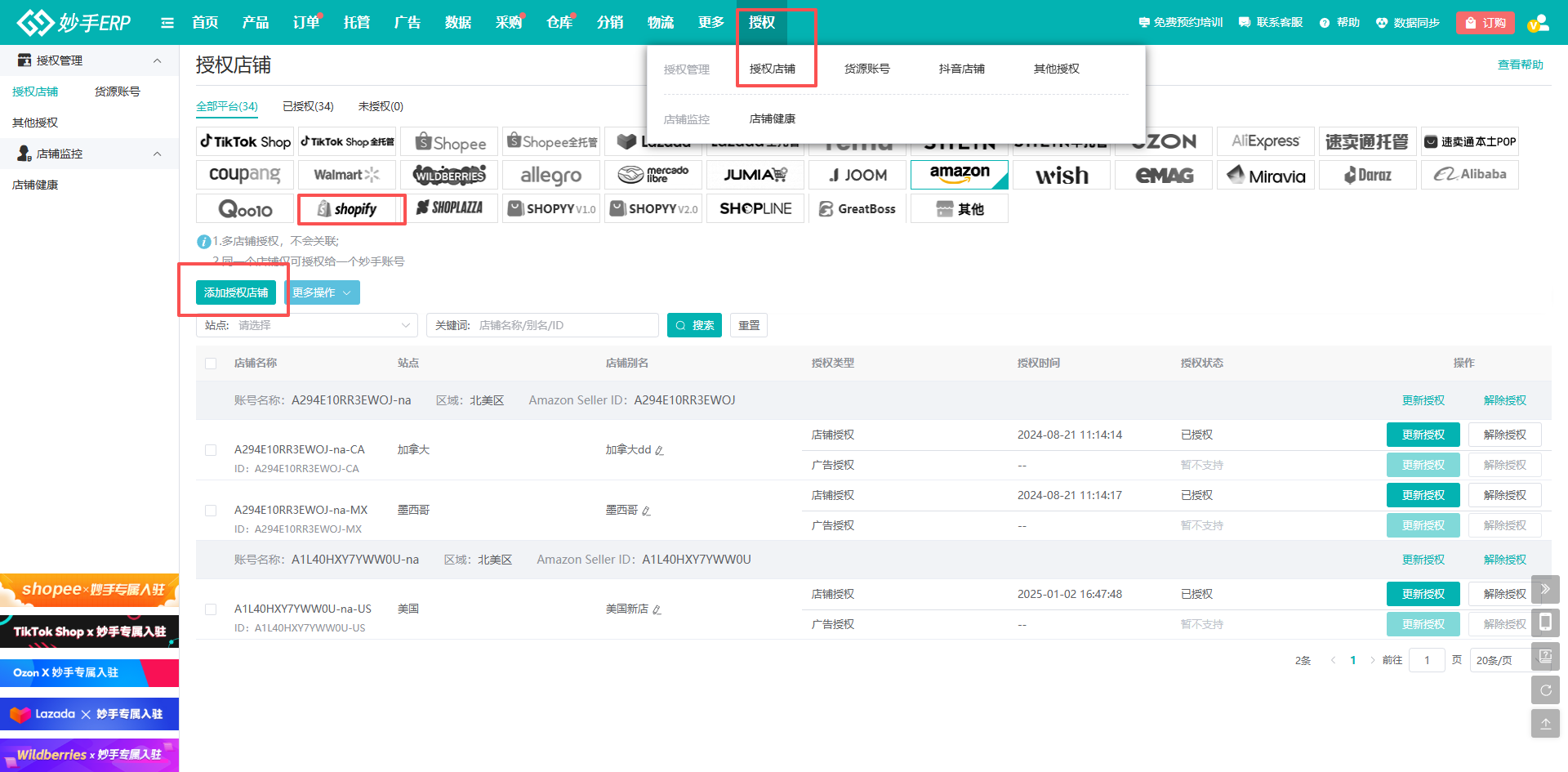 (2)注册账号后,点击授权-授权店铺-添加授权店铺,将您的Shopify店铺授权至妙手,首次完成授权后,后续可跳过此步骤。