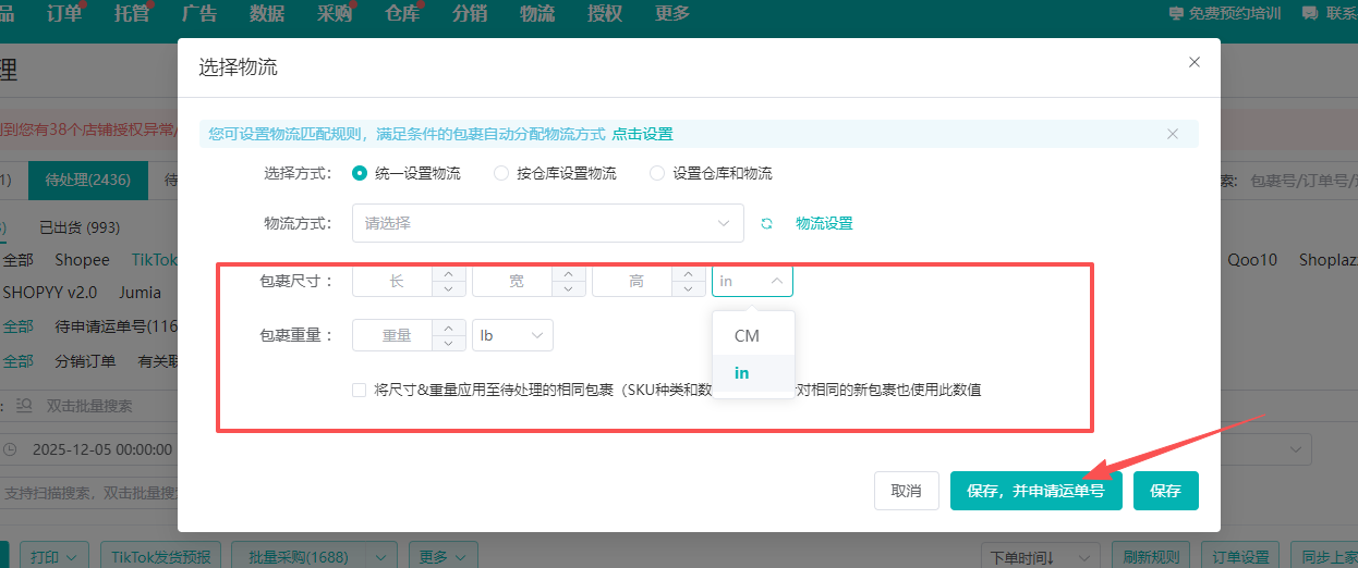 (5)继续完善包裹尺寸、重量信息,尺寸位置Tiktok美区地区的包裹请使用英制单位,所有信息填写完毕后,点击【保存,并申请运单号】