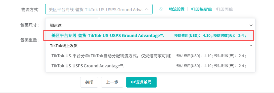 (4)美区订单需要先选择物流,继续点击【更多】=>选择物流,在弹窗中,物流需要选择TK拼接物流,设置好之后点击【申请运单号】