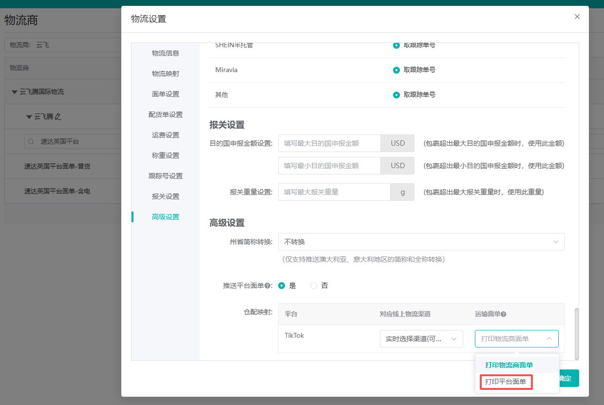 ①高级设置中, 是否推送平台面单中,选择“是“,开启后,才会自动获取TikTok尾程面单推送给物流商