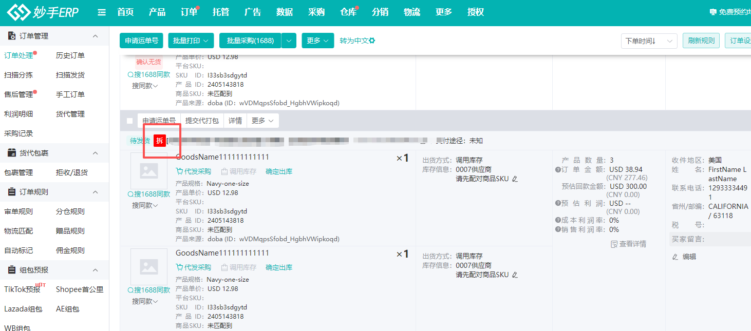 2、平台会在订单产生时会对订单包裹做基础校验,如果平台认为订单包裹会超出物流揽收的限制,会给订单打上“超限拆分”的标识,此时也会同步到妙手ERP中,