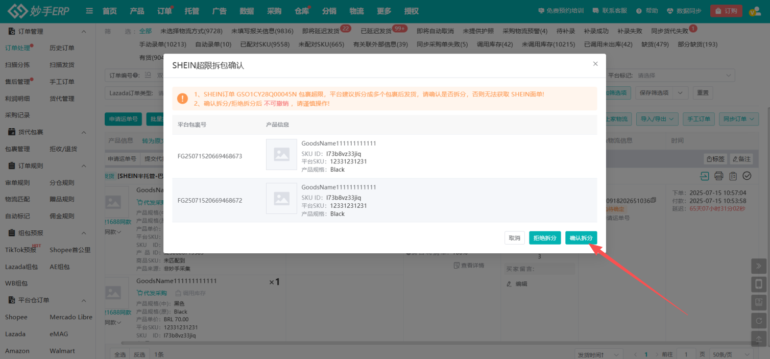 4、点击超限拆包后,会显示“SHEIN超限拆包确认”的弹窗,点击【确认拆分】,订单即可被拆分成多个订单