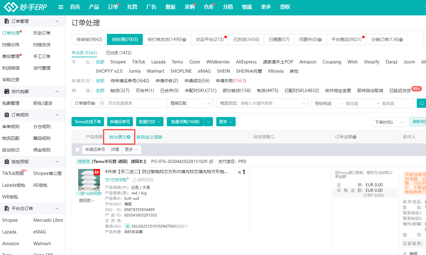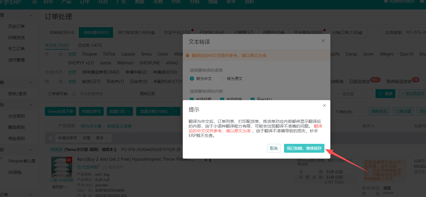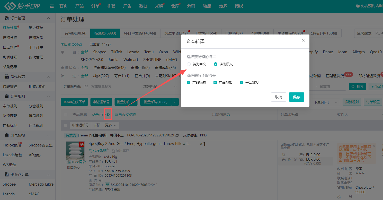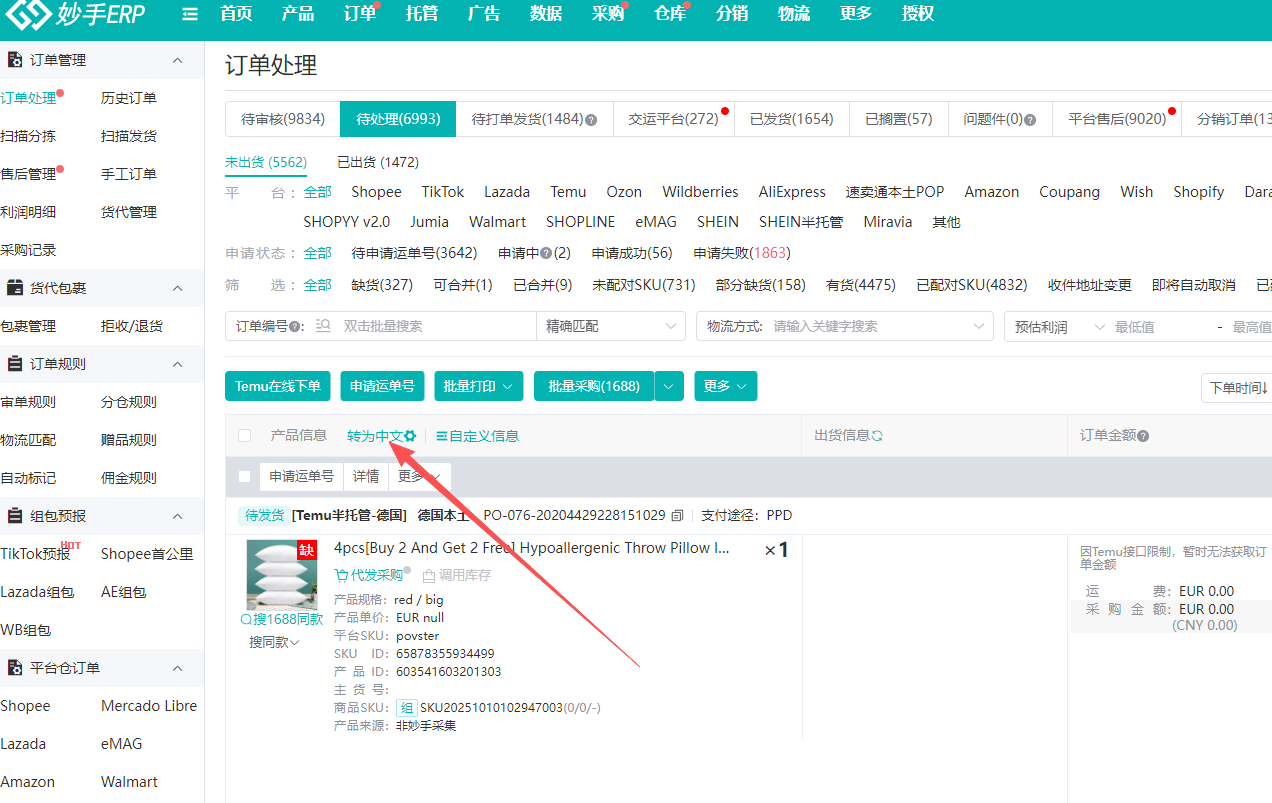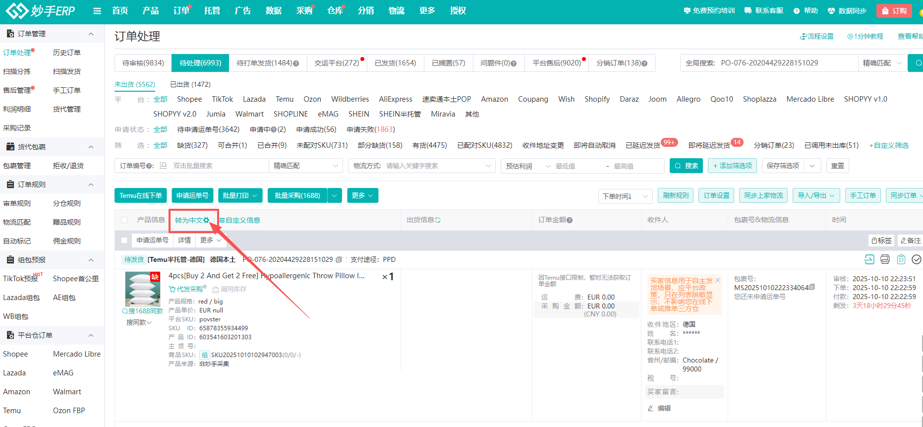 5、继续到订单处理,点击【转为中文】,即可转译为中文内容