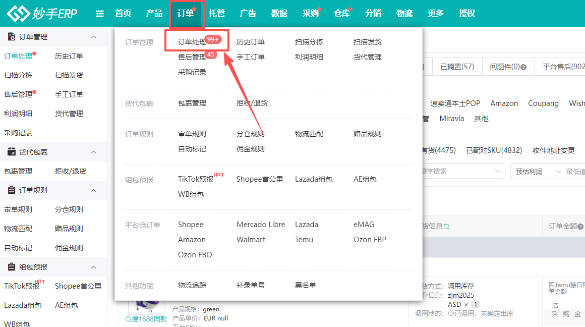 2、进入订单处理,找到下方图示框选的位置,点击此处可以切换订单语言