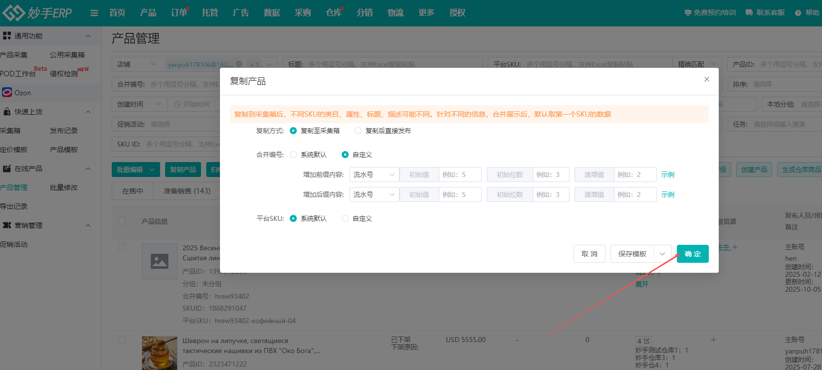 (6)内容设置完成后,点击【确定】,即可复制产品