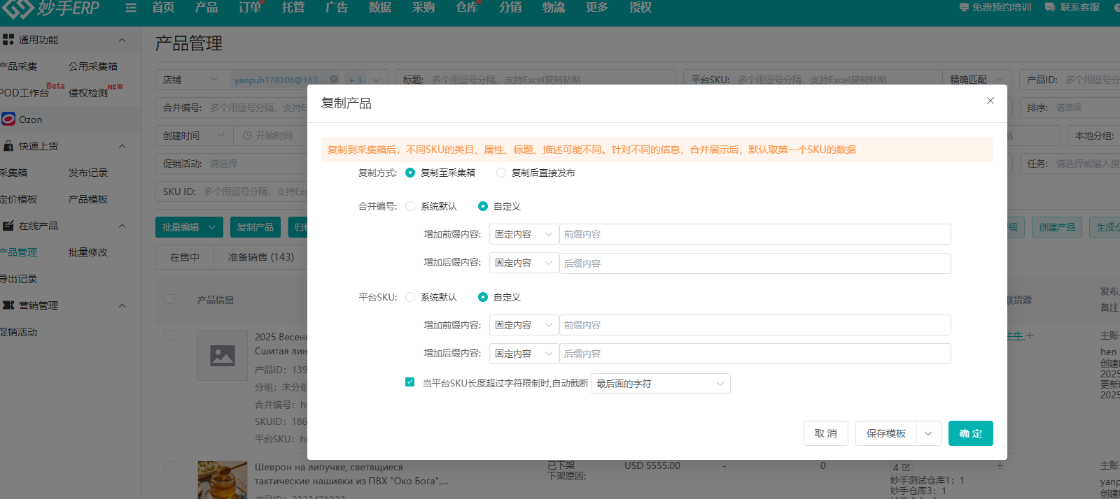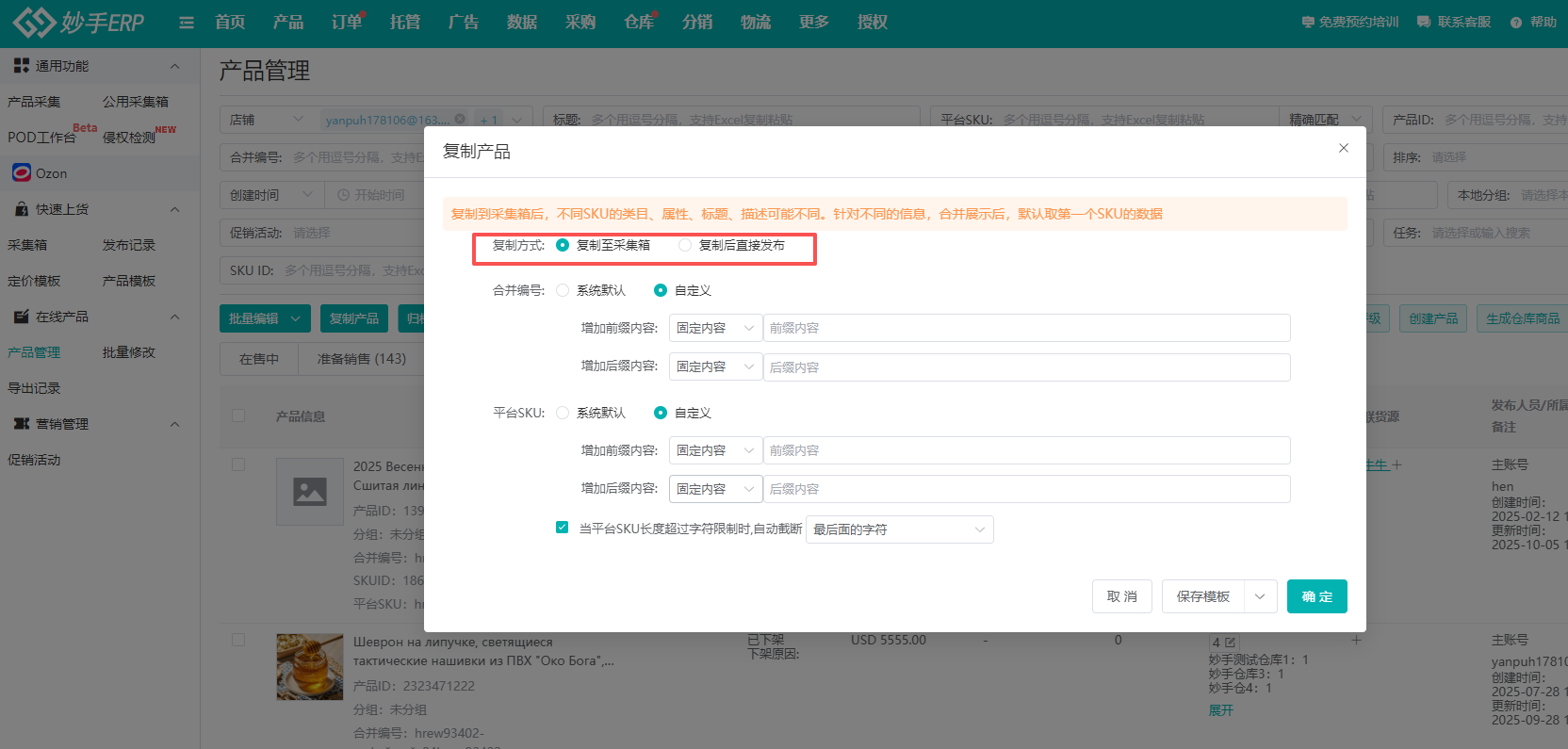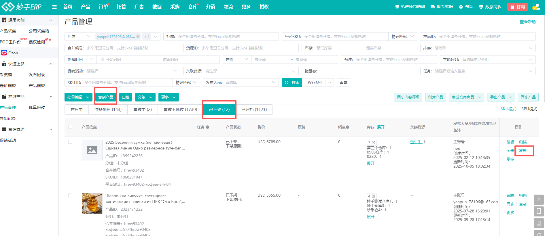1、针对Ozon平台产品,产品下架后可以通过复制功能快速创建新产品发布