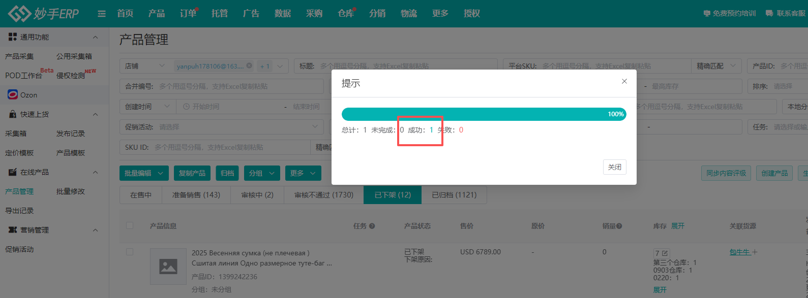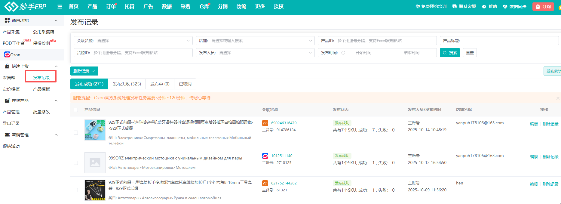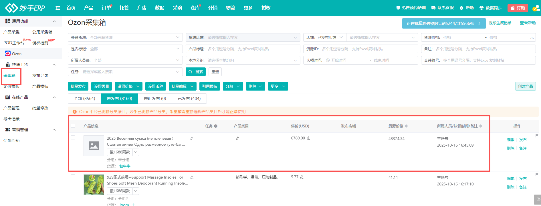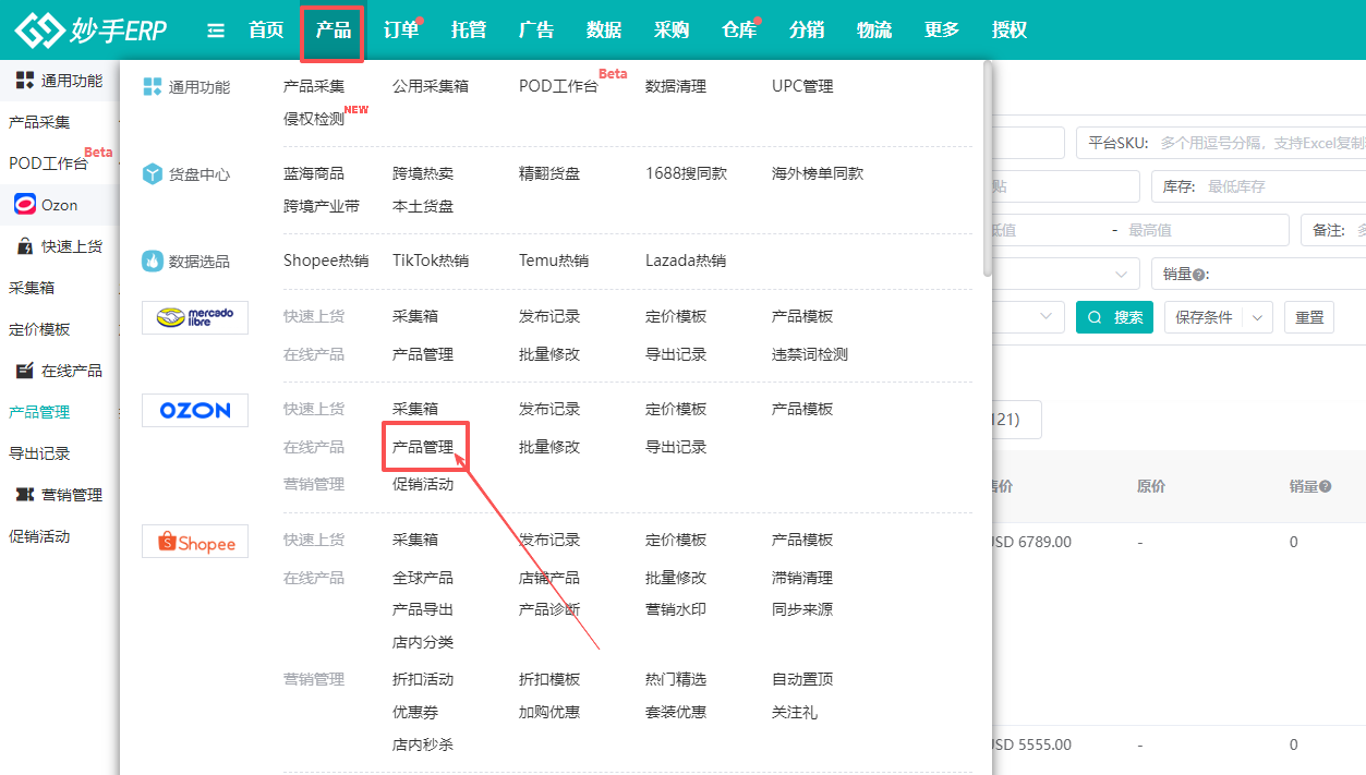 1、进入妙手ERP=>Ozon=>产品管理,已发布的产品同步显示在产品管理的功能界面中