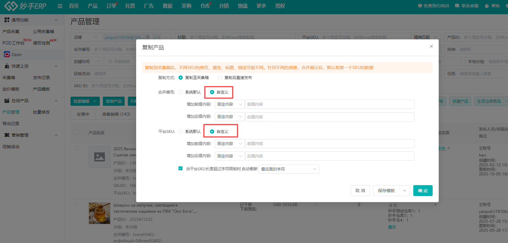 2、用户在重新上品时能够设置自定义合并编码、平台SKU不重复,规避重复上品的风险